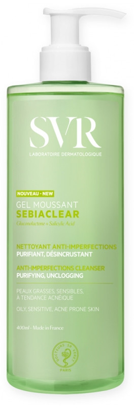 Sebiaclear Gel Moussant 400ml a été développé par les laboratoires SVR pour nettoyer, purifier et désincruster en douceur la peau. Ce soin est destiné aux peaux mixtes à grasses à tendance acnéique et sensibles. Il aide à estomper les imperfections cutanées au niveau du visage ou du corps, à évacuer les impuretés et à se défaire de l’excès de sébum.