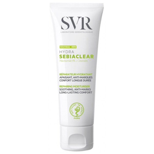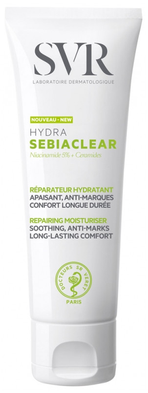 SVR Sebiaclear Hydra, soin réparateur, hydratant et anti-marques doit son efficacité à sa formule incluant des actifs dermatologiques judicieusement sélectionnés. Il contient du niacinamide dosé à 5% pour atténuer les inflammations liées aux marques rouges et diminuer leur apparence. Les omégas céramides rétablissent la barrière protectrice cutanée. Les sucres hydrophiles apportent une hydratation en profondeur et prolongée. Au bout de quelques applications, les rugosités et les squames sont nettement réduites. Sa texture micro-aérée, non collante et non grasse exerce une action matifiante sur la peau du visage tout en offrant une sensation de confort. Sa formule non comédogène, hypoallergénique, au pH physiologique minimise les risques d’allergie pour les peaux sensibles.