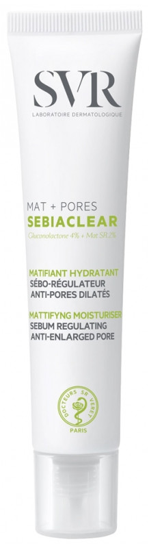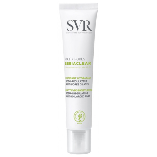 Sebiaclear Mat + Pores 40ml des laboratoires SVR est un soin sébo-régulateur matifiant de haute tolérance. Spécialement dédié aux peaux mixtes à grasses, ce correcteur aide à combattre les pores dilatés et à traiter les points noirs, les boutons et zones de brillance dus à l’excès de sébum.