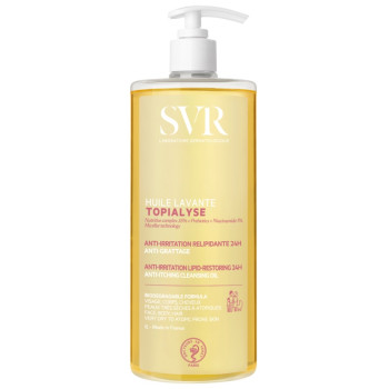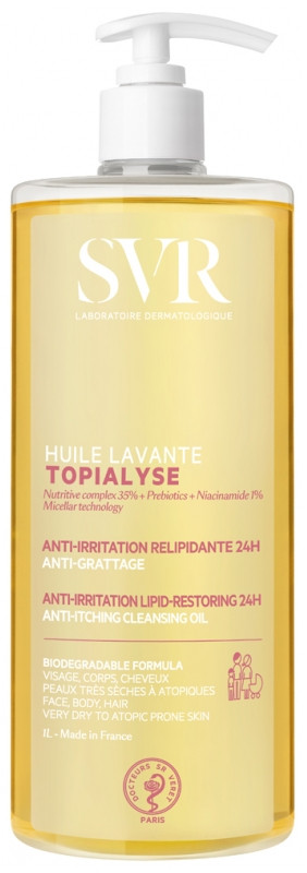 Topialyse Huile Lavante de SVR est un nettoyant anti-grattage pour visage, corps et cheveux. Elle nettoie tout en douceur, nourrit intensément et apaise les sensations de grattage des peaux très sèches à atopiques de toute la famille.