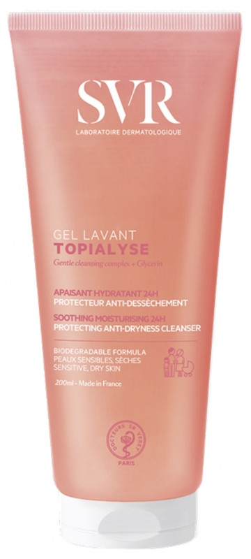 Topialyse Gel Lavant des laboratoires SVR est un nettoyant apaisant, hydratant, protecteur et anti-déssèchement. Il convient aux peaux sensibles et sèches.