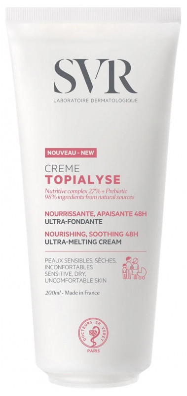 Topialyse Crème des laboratoires SVR est une crème ultra-fondante nourrissante et apaisante pour le visage et le corps. Elle est destinée au soin des peaux sensibles, sèches et inconfortables de toute la famille.