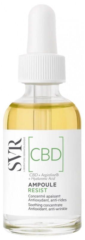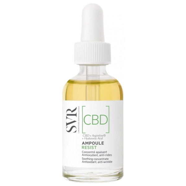 [CBD] Ampoule Resist des laboratoires SVR est un concentré apaisant, antioxydant et anti-rides pour les peaux sensibilisées (stress urbain - pollution - UV), irritées (sécheresse) et présentant des signes de l'âge (rides - ridules).