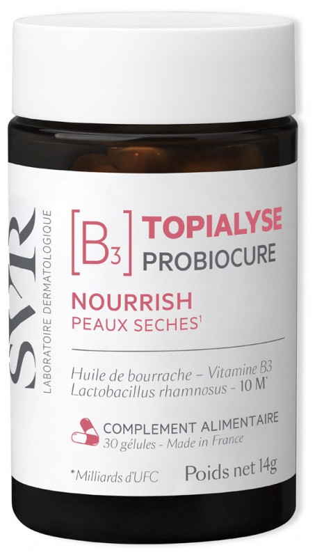 Topialyse Probiocure Nourrish des laboratoires SVR est un complément alimentaire à base de probiotiques pour le soin des peaux sèches, à associer aux soins topiques.
