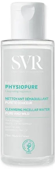 Physiopure Eau Micellaire 75ml du laboratoire SVR est conçue pour ôter le maquillage tout en douceur. Elle s’adapte à tous les types de peaux, même les plus sensibles et réactifs. Cette eau nettoyante permet d’enlever les traces de maquillage sur l’ensemble du visage, y compris les lèvres et les yeux.