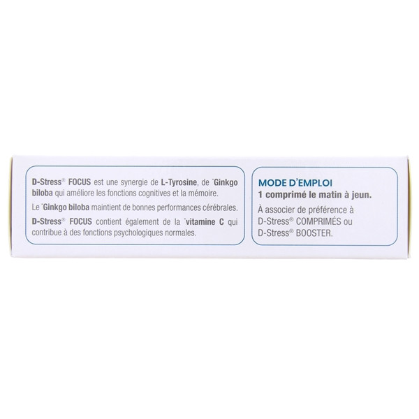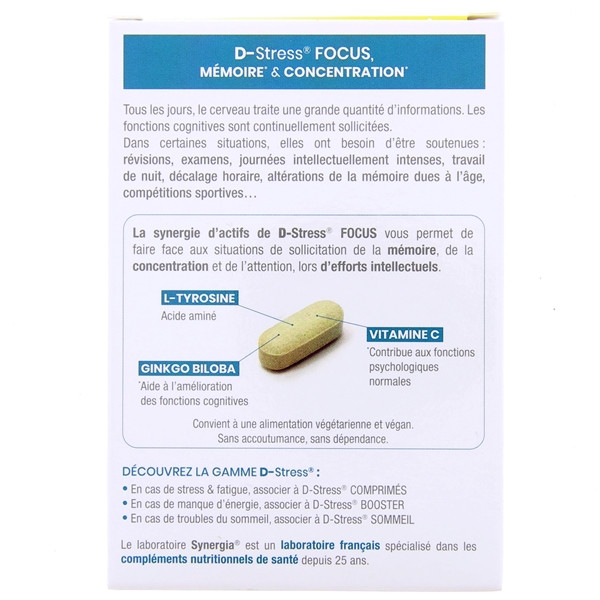 D-Stress Focus est un complément alimentaire du laboratoire Synergia formulé à base de L-Tyrosine, Ginkgo biloba et de vitamine C. Il est indiqué pour stimuler la mémoire et la concentration.