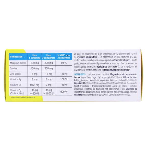 Agent De Charge : Cellulose Microcristalline. Magnésium Liposomal [Magnésium. Anti-Agglomérant: Amidon De Riz. Emulsifiant : Sucrose Ester D’acides Gras, Lécithine. Anti-Agglomérant : Triphosphate De Calcium. Agent De Charge : Farine De Riz]. Acide Aminé : Taurine. Agents D’enrobage : Hydroxypropylméthylcellulose, Hydroxypropylcellulose. Anti-Agglomérant : Dioxyde De Silicium. Anti-Agglomérant : Stéarate De Magnésium. Vitamines B5, Vitamines B6. Anti-Agglomérant : Talc. Agent D’enrobage : Huile De Coco Fractionnée. Vitamine D3. Colorant: Carmin Indigo.