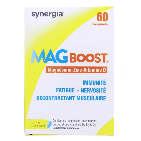 Mag Boost de Synergia est un complément alimentaire à base de magnésium, d’acides aminés et de vitamines. Il est indiqué pour redynamiser l’organisme en cas de stress, de nervosité, de surmenage ou encore de fatigue musculaire. En effet, cette combinaison d’actifs offre une triple action sur la nervosité, sur la fatigue et sur l’immunité. Nervosité, fatigue, tensions musculaires ? Optez pour ce complément alimentaire innovant pour booster votre organisme.