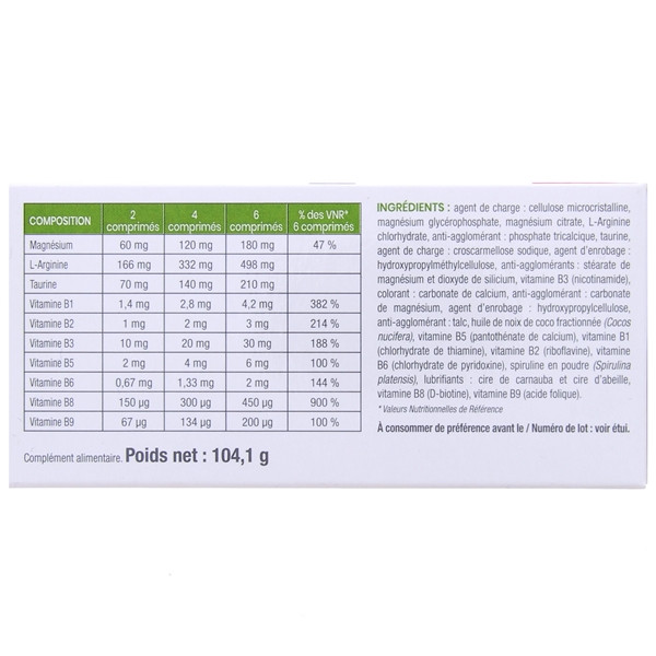 Glycérophosphate de magnésium, arginine, taurine, carbonate de magnésium, trisilicate de magnésium, stéarate de magnésium végétal, vitamine PP, vitamine B1, vitamine B5, vitamine B6, vitamine B2, vitamine B8 et vitamine B9.