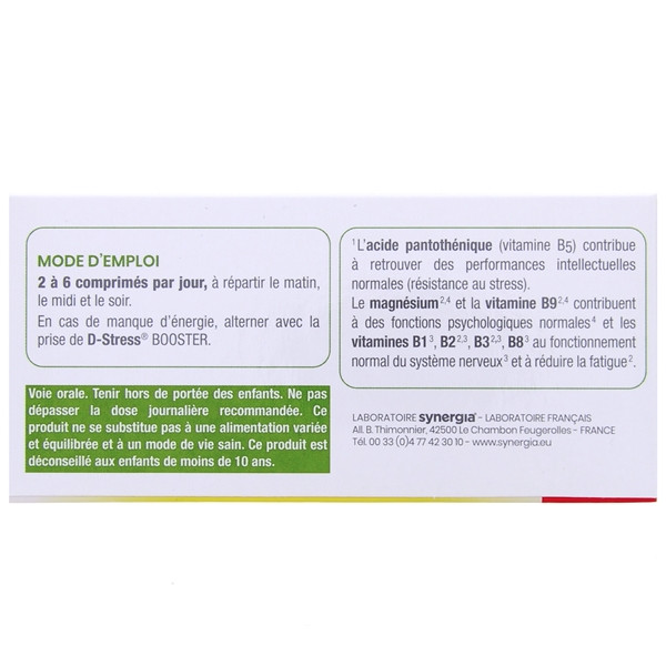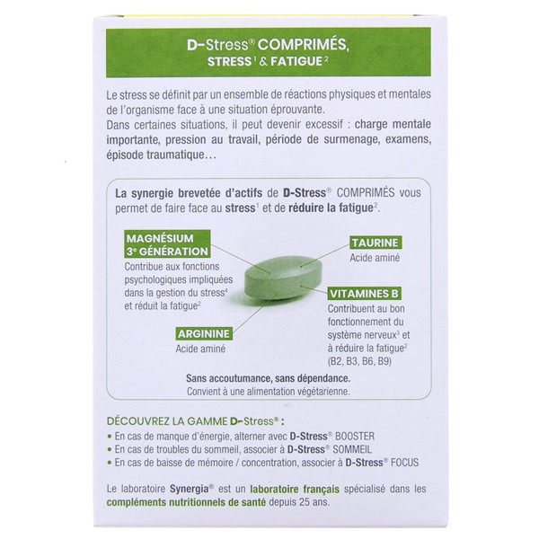 Le complément alimentaire D-Stress des laboratoires Synergia, formulé à base de magnésium 3eme génération, arginine, taurine et vitamines B, est indiqué pour réduire le stress et la fatigue.