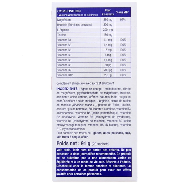 Agent de charge : maltodextrine, citrate de magnésium, glycérophosphate de magnésium, fructose, acidifiant : acide citrique, arômes naturels de fruits rouges et noirs, acidifiant : acide malique, L-arginine, extrait de racine de rhodiole (Rhodiola rosea L.), poudre de fraise, taurine, colorant : jus de betterave, édulcorant : sucralose, vitamine B3 (nicotinamide), vitamine B5 (acide pantothénique), vitamine B2 (riboflavine), vitamine B6 (chlorhydrate de pyridoxine), vitamine B1 (chlorhydrate de thiamine), vitamine B9 (acide pteroylmonoglutamique), vitamine B8 (D-biotine), vitamine B12 (cyanocobalamine). Peut contenir des traces de : gluten, oeufs, poissons, soja, lait, fruits à coque, céleri. Contient sucre et édulcorant.