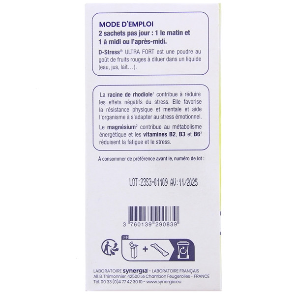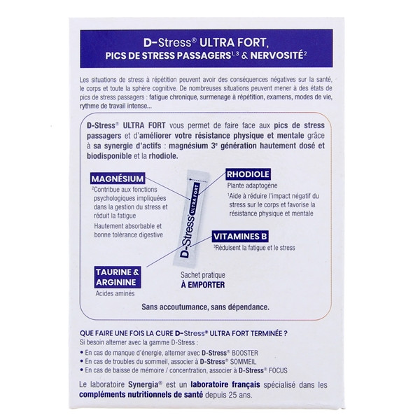 Élaboré par le laboratoire Synergia, D-Stress Ultra-Fort se présente comme un complément alimentaire apte à baisser la pression durant les moments de stress ponctuel. Il permet de réduire les pics de stress nuisibles à la santé physique et mentale.