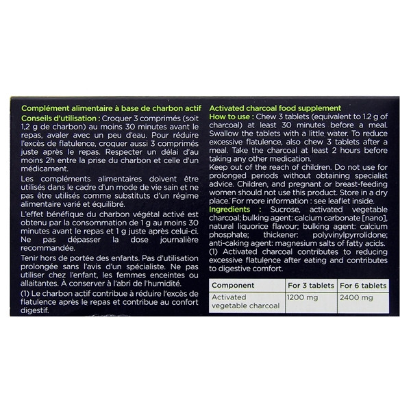 Il est conseillé de croquer 3 comprimés de ce produit pharmaceutique au moins 30 minutes avant le repas avec un peu d’eau. Pour éviter l’excès de flatulence, il est indiqué d’administrer 3 comprimés, juste après le repas. Respectez un délai de 2 heures entre la prise du charbon et celle d’un autre médicament.
