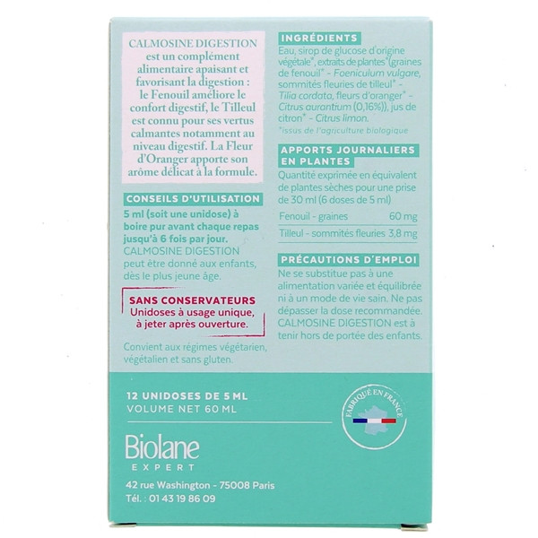 Calmosine Digestion est une boisson apaisante aux extraits de plantes bio, dont le fenouil et le tilleul, pour favoriser la digestion. Ce complément alimentaire est utilisable dès le plus jeune âge.