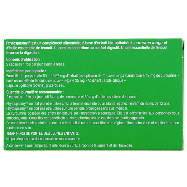 PhytoSpasmyl est un complément alimentaire sous forme de capsules formulé à base de Curcuma Longa et d'huile essentielle de fenouil.