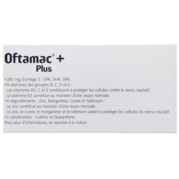 Oftamac+ Plus est un complément alimentaire antioxydant à visée oculaire. Formulé à base de vitamines, de minéraux, d'oméga 3 et d'antioxydants, Oftmac Plus contribue à maintenir une vision normale.