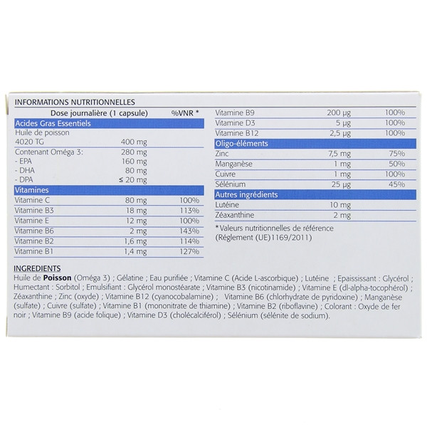 Huile de poisson (oméga 3); gélatine; eau purifiée; vitamine C (acide L-ascorbique); lutéine; épaississant : glycérol; humectant : sorbitol; émulsifiant : glycérol monostéarate; vitamine B3 (nicotinamide); vitamine E (dl-alpha-tocophérol); zéaxanthine; zinc (oxyde); vitamine B12 (cyanocobalamine); vitamine B6 (chlorhydrate de pyridoxine); manganèse (sulfate); cuivre (sulfate); vitamine B1 (mononitrate de thiamine); vitamine B2 (riboflavine); colorants : oxyde de fer noir; vitamine B9 (acide folique); vitamine D3 (cholécalciférol); sélénium (sélénite de sodium).