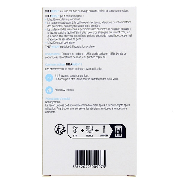 Theawashest une solution de lavage Oculaire stérile et sans conservateur pour adultes et enfants. Elle est indiquée pour l'hygiène oculaire quotidienne, l'hygiène post opératoire et le traitement des irritations superficielles.