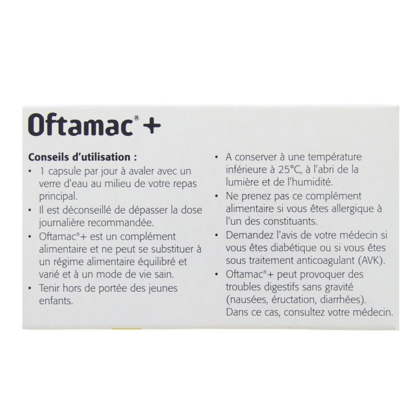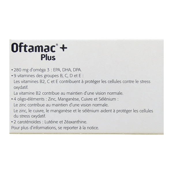 Le complément alimentaire Oftamac Plus est à visée oculaire. Sa formule complète à base de vitamines, de minéraux, d'oméga 3 et d'antioxydants contribue au maintien d'une vision normale.