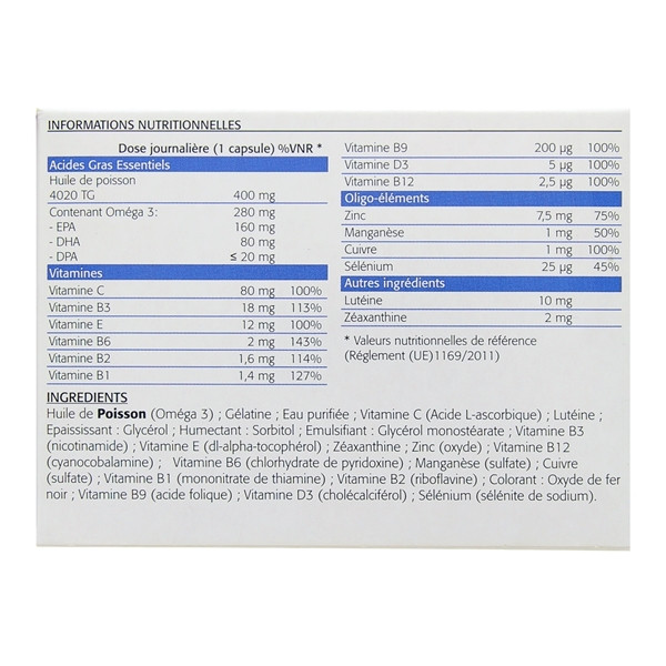 Huile de poisson (oméga 3); gélatine; eau purifiée; vitamine C (acide L-ascorbique); lutéine; épaississant : glycérol; humectant : sorbitol; émulsifiant : glycérol monostéarate; vitamine B3 (nicotinamide); vitamine E (dl-alpha-tocophérol); zéaxanthine; zinc (oxyde); vitamine B12 (cyanocobalamine); vitamine B6 (chlorhydrate de pyridoxine); manganèse (sulfate); cuivre (sulfate); vitamine B1 (mononitrate de thiamine); vitamine B2 (riboflavine); colorants : oxyde de fer noir; vitamine B9 (acide folique); vitamine D3 (cholécalciférol); sélénium (sélénite de sodium).