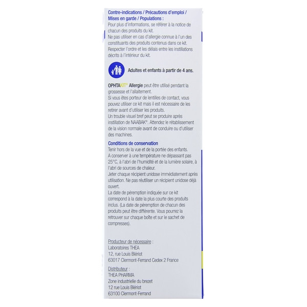 - Se laver soigneusement les mains et, s’il y a lieu, retirer les lentilles de contact avant d’utiliser les produits de Théa Ophtakit Allergie Kit 3 en 1 Prise en Charge des Symptômes.