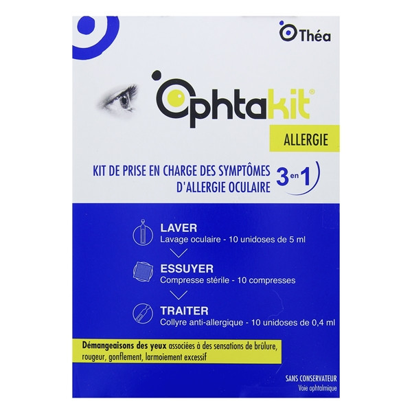 Ophtakit Allergie est un kit de prise en Charge des symptômes d'allergies oculaire 3en1 proposé par les laboratoires Théa. Ophtakit Allergie offre 3 action en 1 boîte : Laver, essuyer et traiter les yeux.