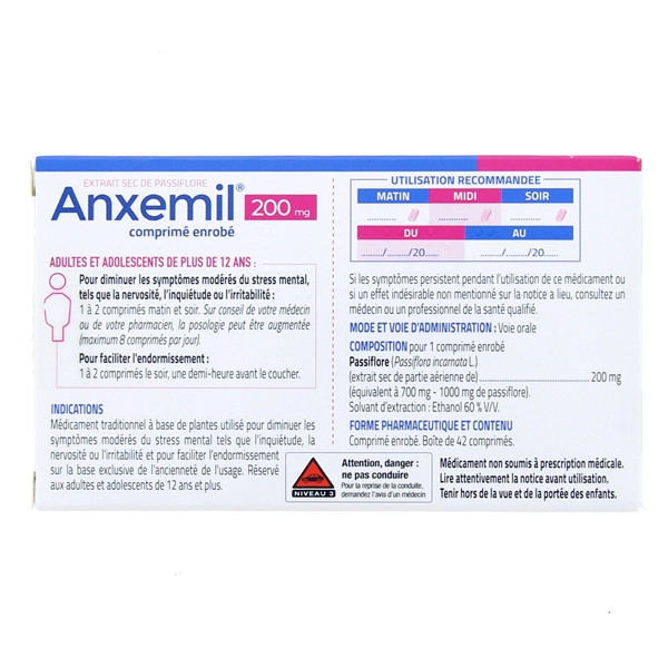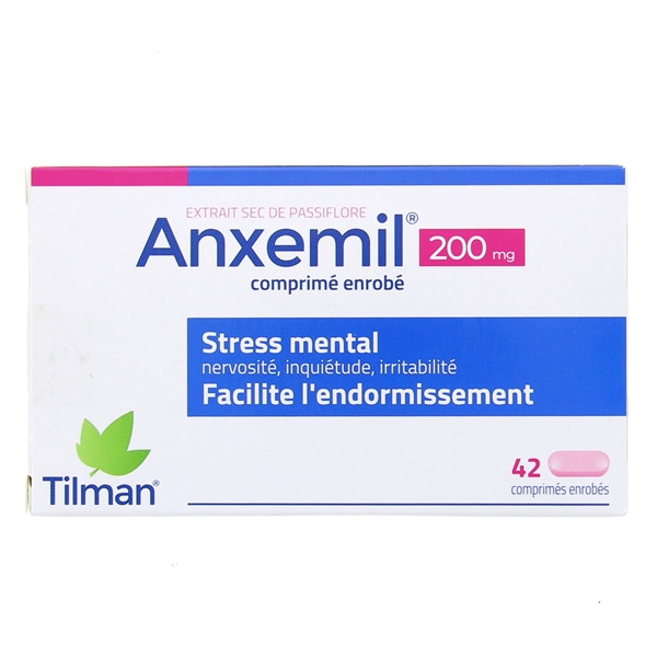 Anxemil est un médicament non soumis à prescription médicale à base d'extrait sec de passiflore. Anxemil est indiqué pour faciliter l'endormissement et traiter le stress mental modéré tel que la nervosité, l'inquiétude et l'irritabilité.