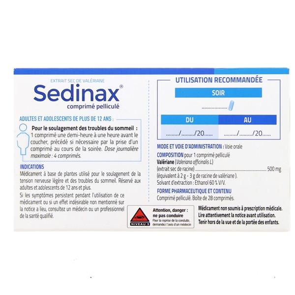 Sedinax Troubles du Sommeil est un médicament à base d'extrait sec de valériane. Sedinax est indiqué pour le soulagement de la tension nerveuse légère et des troubles du sommeil chez l'adulte et l'adolescent de plus de 12 ans.