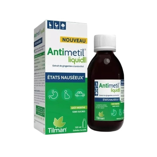 Antimetil Liquid du laboratoire Tilman est une solution buvable à base de gingembre indiquée dans les cas d'états nauséeux. Antimetil Liquid peut être utilisé en cas d'excès alimentaires, de régime alimentaire inhabituel, de mal des transports et lors de la grossesse.