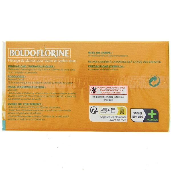 La tisane Boldoflorine, recommandée en cas de constipation, est disponible en boîte de 24 sachets-doses.