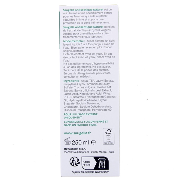 L'antiseptique naturel spécial toilette intime. Développé en flacon de 250 ml. Renfermant un extrait de thym, aux bienfaits antibactériens, cette émulsion lavante antiseptique soulage les démangeaisons sur les muqueuses et la flore vaginale. Vous retrouvez durablement et rapidement un bien-être intime. Cette solution lavante pour usage intime contient également un extrait naturel de sauge. La flore vaginale retrouve son équilibre physiologique. Grâce à l'intervention des actifs naturels, cet antiseptique combat les désagréments du quotidien se produisant durant la grossesse ou les règles.