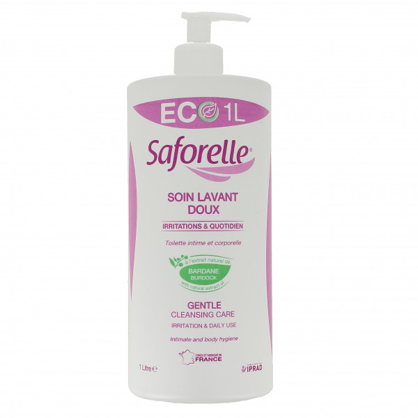 Le soin lavant doux de la marque Saforelle est indiqué pour l'hygiène intime et corporelle quotidienne des peaux irritées. Il est formulé à partir d'une association d'agents surgras et d'extraits de Bardane. Doté d'un pH alcalin doux, ce soin répond aux besoins santé des peaux irritées et particulièrement sensibles. Les actifs contenus dans ce soin nettoient la peau en douceur et apaisent les désagréments touchant la sphère intime : irritations, démangeaisons et mauvaises odeurs. Ce soin hypoallergénique ne contient pas de paraben.