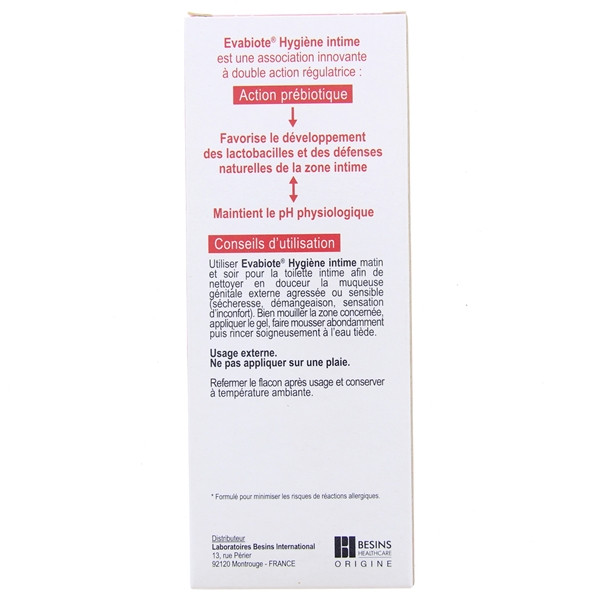 Evabiote Hygiène intime Gel Lavant est une association à double action régulatrice. Il apaise et lave en douceur en préservant et en renforçant les défenses naturelles cutanées (action prébiotique) et en maintenant le pH physiologique.