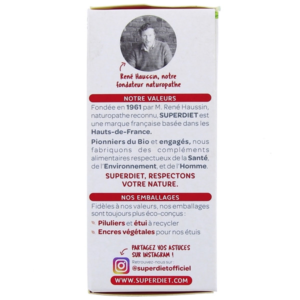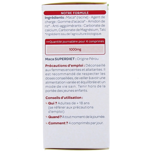 Les Laboratoires Super Diet ont sélectionné pour vous un extrait de Maca issu de l'agriculture biologique vous apportant 1000 mg de Maca Bio pour 4 comprimés.
