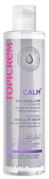 Calm+ Eau Micellaire Apaisante de Topicrem nettoie, démaquille et apaise les yeux et les peaux intolérantes. Grâce à ce soin nettoyant démaquillant sans rinçage les sensations d'inconfort sont apaisées et la peau est parfaitement nettoyée.