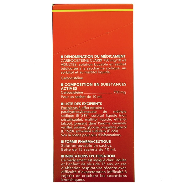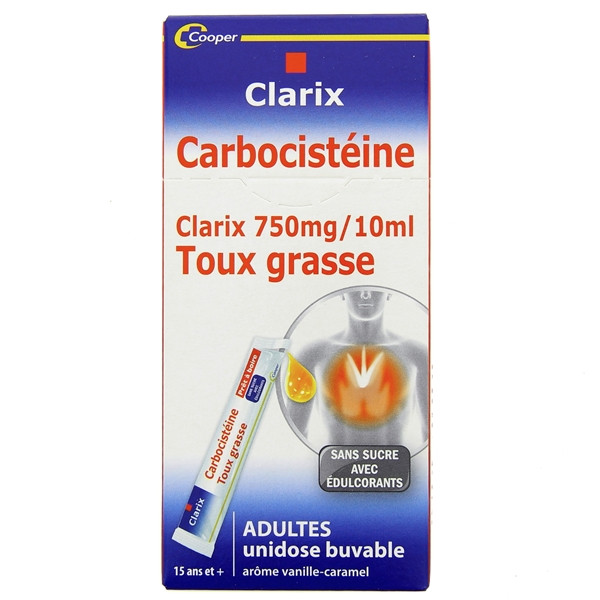 Le médicament Clarix Carbocistéine 750mg/10ml est disponible en boîte de 15 unidoses buvables, arôme Vanille-caramel.