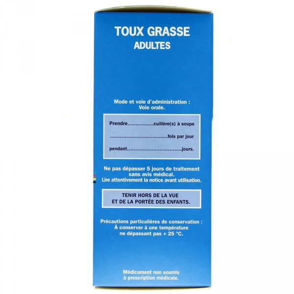 - Adulte : 1 cuillère à soupe de sirop Adulte ou 1 godet doseur de 15 ml de solution buvable à 5 %, 3 fois par jour.