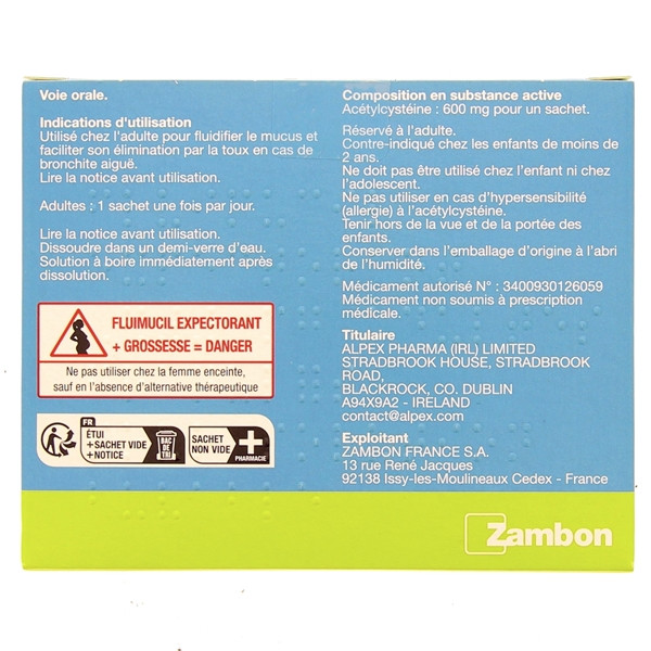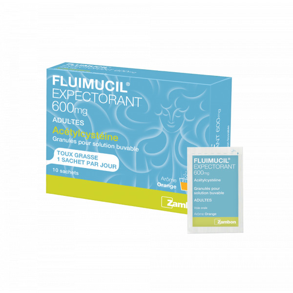 L’acétylcystéine, principe actif du Fluimucil, fluidifie l’excès de sécrétions bronchiques (glaires) et facilite ainsi leur évacuation par la toux (crachats). Fluimucil expectorant 600mg ne nécessite qu'une prise par jour et est disponible en boîte de 10 sachets arôme orange.