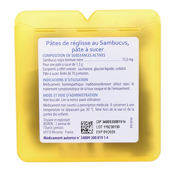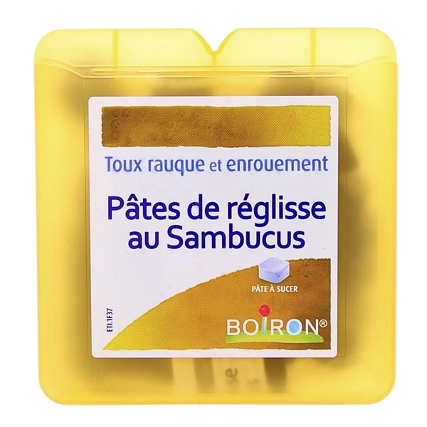 Les pâtes à sucer de réglisse au Sambucus sont un médicament homéopathique des laboratoires Boiron. Ce médicament est recommandé pour le traitement symptomatique de la toux rauque et de l'enrouement.