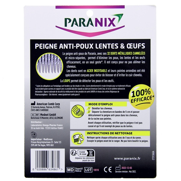 - Nettoyez votre Peigne métallique anti-poux lentes & œufs de Paranix après chaque utilisation afin d’éviter toute récidive. Cet accessoire doit être absolument exempt de lentes ou de poux avant et après chaque usage.