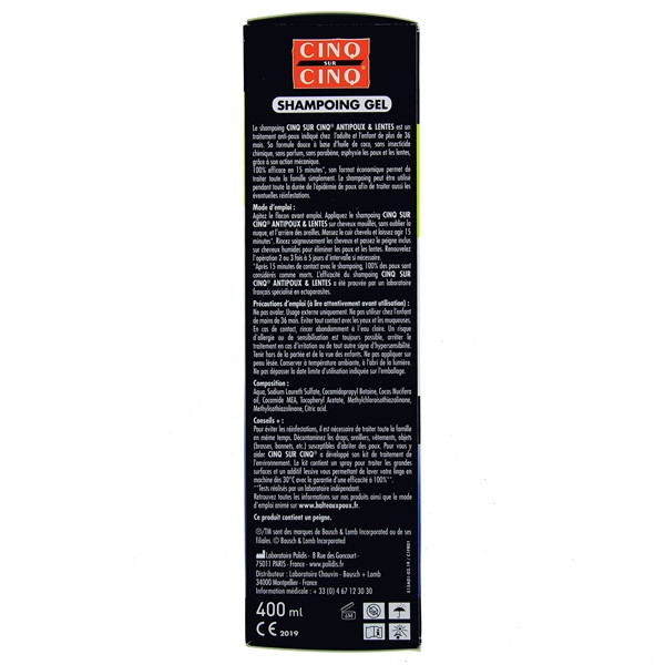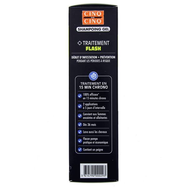 Le shampooing gel anti-poux & lentes Traitement Flash élaboré par la marque Cinq sur Cinq est un traitement qui convient à l'adulte et à l'enfant de plus de 36 mois. Ce shampooing contient de l'huile de coco qui agit en asphyxiant les poux pour ne pas leur laisser une possibilité de résistance. Les poux sont tués de façon mécanique. Le shampooing Gel proposé par la marque Cinq sur Cinq ne contient ni paraben, ni insecticide, ni parfum ce qui réduit les risques d'irritations et d'allergies. Il est surtout conseillé pendant les périodes d'épidémie de poux.