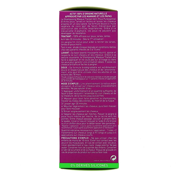 Puressentiel Shampoing traitant 2 en 1 anti-poux est à la fois un masque et un shampoing qui permet de se débarrasser des poux ainsi que de leurs larves et lentes tout en nettoyant les cheveux. En même temps qu’il éradique les poux infestant le cuir chevelu, ce shampoing masque nourrit les cheveux en profondeur et apporte souplesse et brillance.