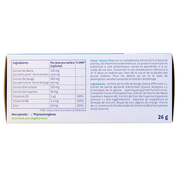Extrait de feuille de sauge (Salvia officinalis L.), Extrait de feuille et de capitule d'artichaut (Cynara Scolymus L.), Enveloppe de la gélule : Hydroxypropylméthylcellulose, Complexe cuivre chlorophyllines, Extrait de racine de maca (Lepidium meyenii W.), Extrait de fruit de Cayenne (Capsicum annuum L.), Anti-agglomérants : Stéarate de magnésium et Dioxyde de silicium, Oxyde de zinc, Agents de charge : Farine de riz, Vitamine D (Chloécalciférol), Vitamine B6 (Chlorhydrate de pyridoxine).