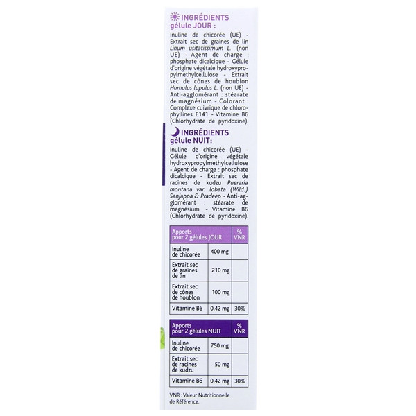 Gélule Jour : Inuline de chicorée, Extrait sec de graines de lin Linum usitatissimum L., Agent de charge : Phosphate dicalcique, Gélule d'origine végétale (Hydroxypropylméthylcellulose), Extrait sec de cônes de houblon Humulus lupulus L., Anti-agglomérant : Stéarate de magnésium, Colorant : Complexe cuivrique de chlorophyllines E141, Vitamine B6 (Chlorhydrate de pyridoxine).