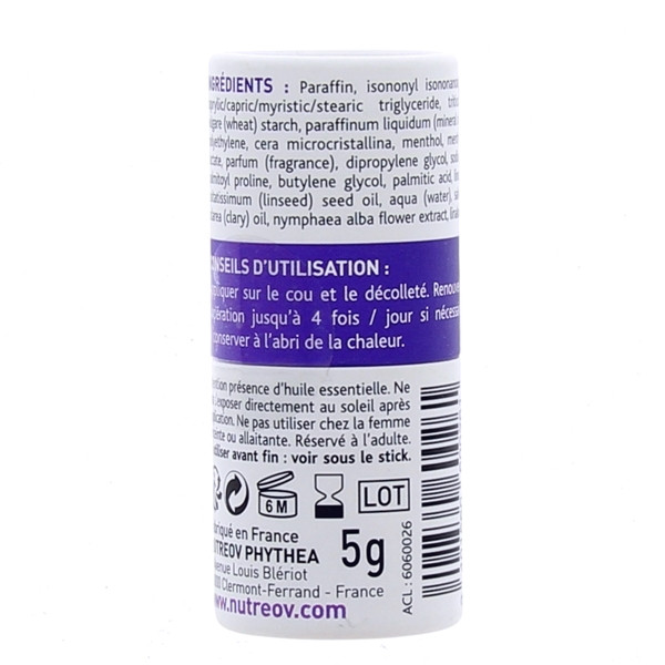 Stick de massage pour les bouffées de chaleur. A l'extrait de fleur de nénuphar blanc (Sepicalm VG WP), d'huile essentielle de sauge sclarée, de menthol et menthyl lactate, à action antirougeurs, antitranspirante et rafraîchissante. Permet de calmer les rougeurs cutanées, de réguler la transpiration et d'apporter un effet frais immédiat. Ne tache pas, ne laisse pas de film gras.