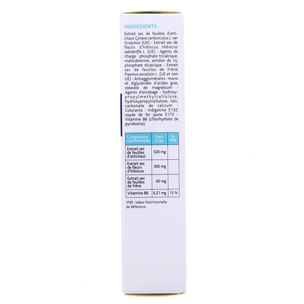 Antiagglomérants : Phosphate Dicalcique, Phosphate Tricalcique, Maltodextrine, Amidon de Riz, Mono Di et Triglycérides d'Acides Gras d'Origine Végétale, Stéarate de Magnsium et Silice, Extrait Sec d'Inflorescence d'Artichaut (Cynara scolymus L.) 520 mg, Extrait Sec de Fleurs d'Hibiscus (Hibiscus Sabdariffa L.) 300 mg, Poudre de Criste Marine (Crithmum Maritimum) 60 mg, Agents d'Enrobage Hypromellose, Cellulose Microcristalline, Mono et Diglycérides Acétylés, Gomme Laque et Polyvinyl Pyrrolidone, Colorants Alimentaires : indigotine E132 oxyde de fer jaune E172 , Excipients qsp Deux Comprimés.