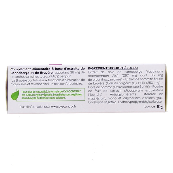 Cys-Control gélules est un complément alimentaire, à base d'extrait de Canneberge et de bruyère, indiqué pour favoriser un bon confort urinaire et contribuer à de bonnes fonctions d'élimination.