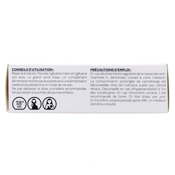Extrait de baie de canneberge (Vaccinium macrocarpon Ait.) - Extrait de sommité fleurie de bruyère (Calluna vulgaris (L.) Hull) - Fibre de pomme (Malus domestica Borkh.) - Poudre de fruit de sarrasin (Fagopyrum esculentum Moench.) - Antiagglomérants : stéarate de magnésium, mono et diglycérides d’acides gras. Enveloppe végétale : Hydroxypropylméthylcellulose.
