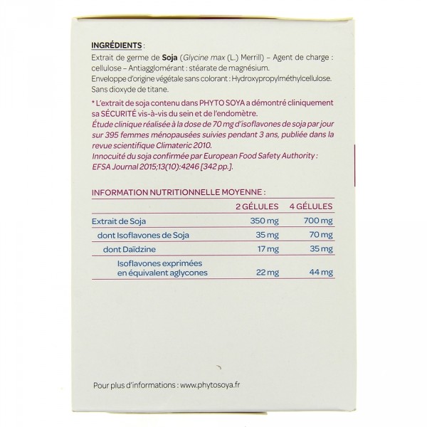 Après 10 ans d’expérience, les laboratoires Arkopharma vous proposent Phyto Soya® : un complément alimentaire composé d’un extrait de Soja de haute Qualité contrôlé, issu de l’agriculture conventionnelle, ne provenant pas d’une source OGM (Organisme Génétiquement Modifié).