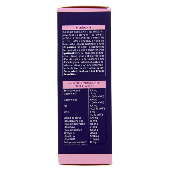 Capsule (protéines de poisson hydrolysées ; stabilisant : glycérol ; colorant : caramel ; arôme : éthylvanilline) ; extrait de citrus riche en flavonoïdes ; huile de poisson riche en oméga 3 ; huile de bourrache riche en acide gamma linoléique ; minéraux : gluconate de fer, gluconate de zinc ; émulsifiant : mono et diglycérides d’acides gras ; Endophospholipides® (phospholipides d’origine marine) ; vitamine E naturelle ; bêta-carotène naturel ; vitamine B9.